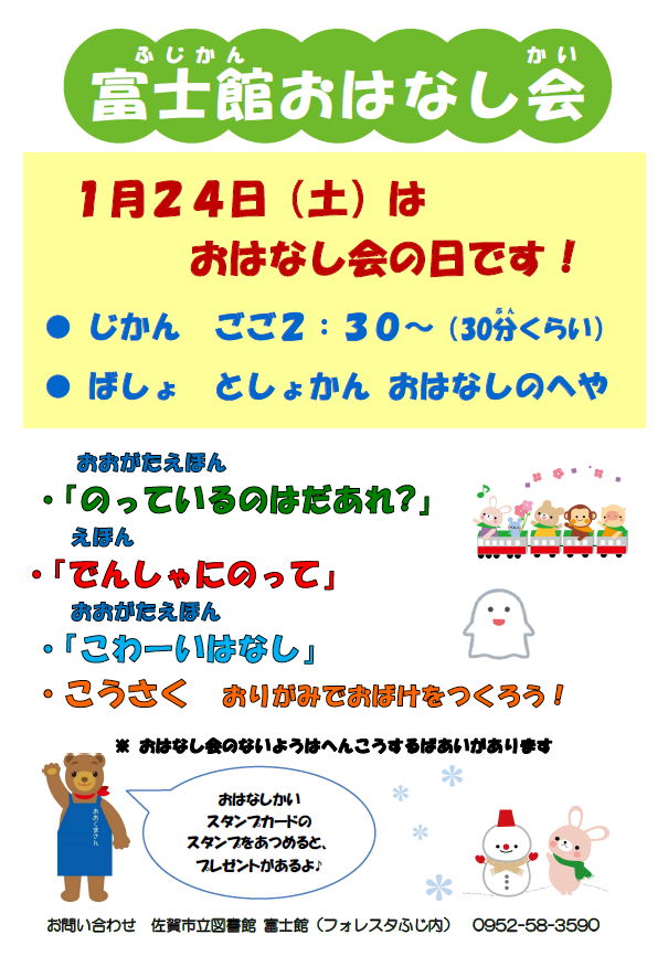 【富士館】1月のおはなし会 おはなし会開催のおしらせ ・日時:1月24日(土) 午後2時30分から(30分程度) ・場所:図書館内 おはなしのへや 絵本の読み聞かせや工作をします。 スタンプを集めるとプレゼントもありますよ。 ぜひ遊びに来てくださいね。