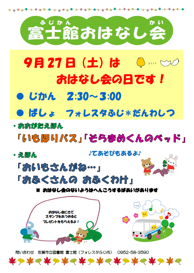 【富士館】9月のおはなし会 おはなし会開催のおしらせ ・日時:9月27日(土) 午後2時30分から(30分程度) ・場所:図書館内 おはなしのへや 絵本や紙芝居の読み聞かせ、手遊びなどをします。 スタンプを集めるとプレゼントもありますよ。 ぜひ遊びに来てくださいね。