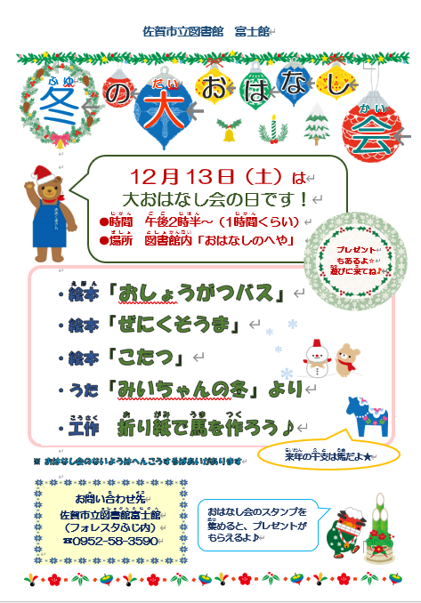 【富士館】「冬の大おはなし会」のお知らせ 「冬の大おはなし会」のお知らせ ・日時:12月13日(土) 午後2時30分から(1時間程度) ・場所:図書館内 おはなしのへや 絵本の読み聞かせや歌、工作などをします。 スタンプを集めるとプレゼントもありますよ。 ぜひ遊びに来てくださいね。