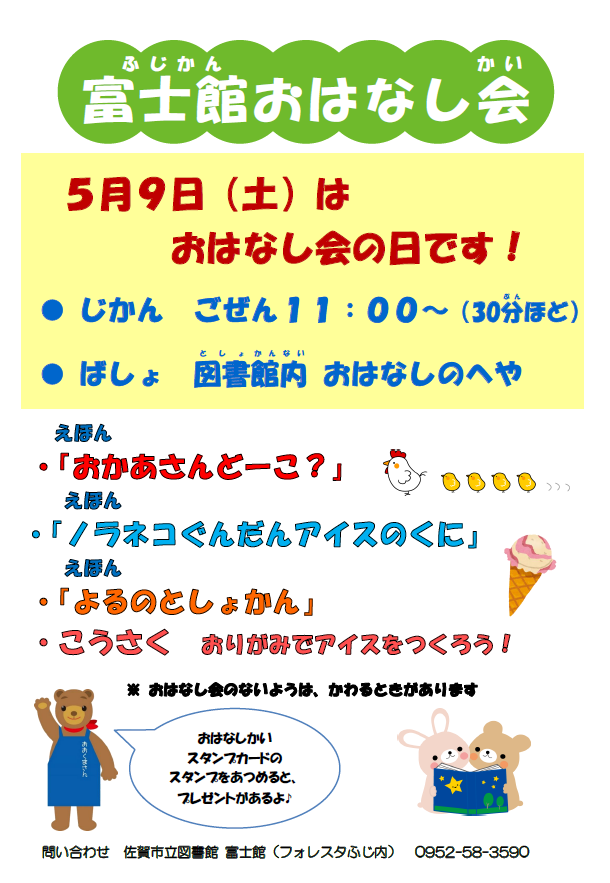 【富士館】5月のおはなし会 おはなし会開催のおしらせ ・日時:令和8年5月9日(土) 午前11時~(30分程度) ・場所:図書館内 おはなしのへや 絵本や紙芝居の読み聞かせ、工作をします。 スタンプを集めるとプレゼントもありますよ。 ぜひ遊びに来てくださいね。